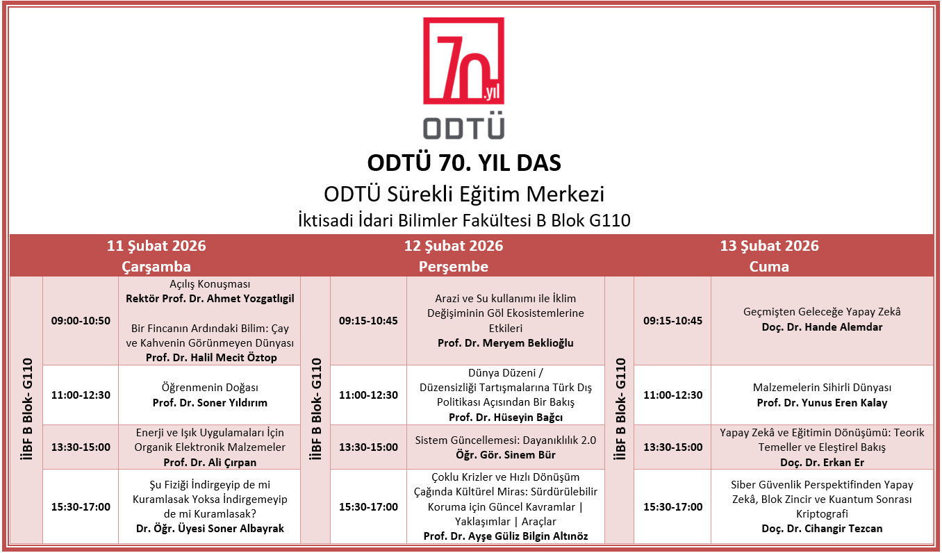 ODTÜ’nün 70. yılı kapsamında, üniversitenin bilgi birikimini toplumla buluşturmayı ve toplumsal katkıyı artırmayı amaçlayan ODTÜ 70. Yıl Dönem Arası Seminerleri (DAS), 11–12–13 Şubat 2026 tarihlerinde ODTÜ İktisadi ve İdari Bilimler Fakültesi B Blok G110 nolu amfide gerçekleştirilecektir.